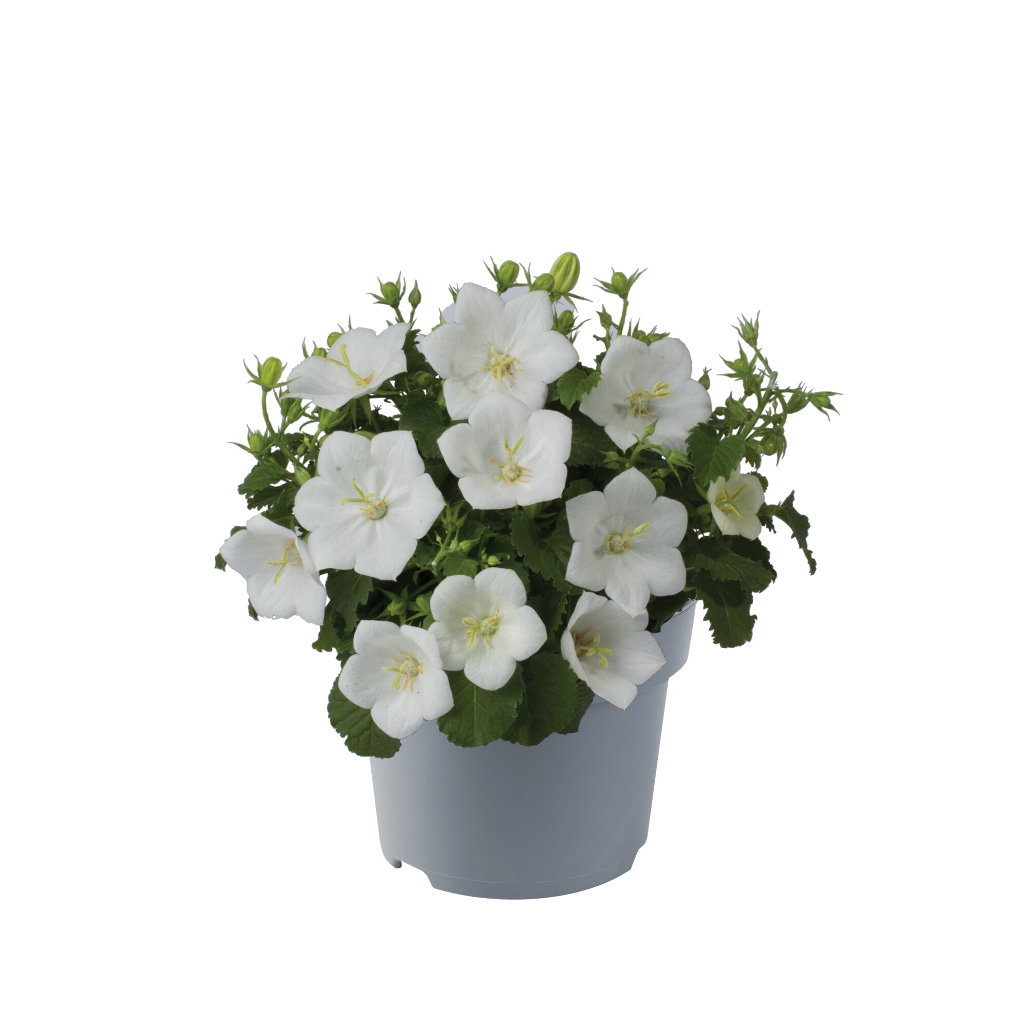 Campanula carpatica ‘Clips White’ ofwel karpatenklokje, bloeit van juni tot juli met witte bloemen. Deze niet-groenblijvende vaste plant heeft een hoogte van 15 cm en gedijt goed in de zon.